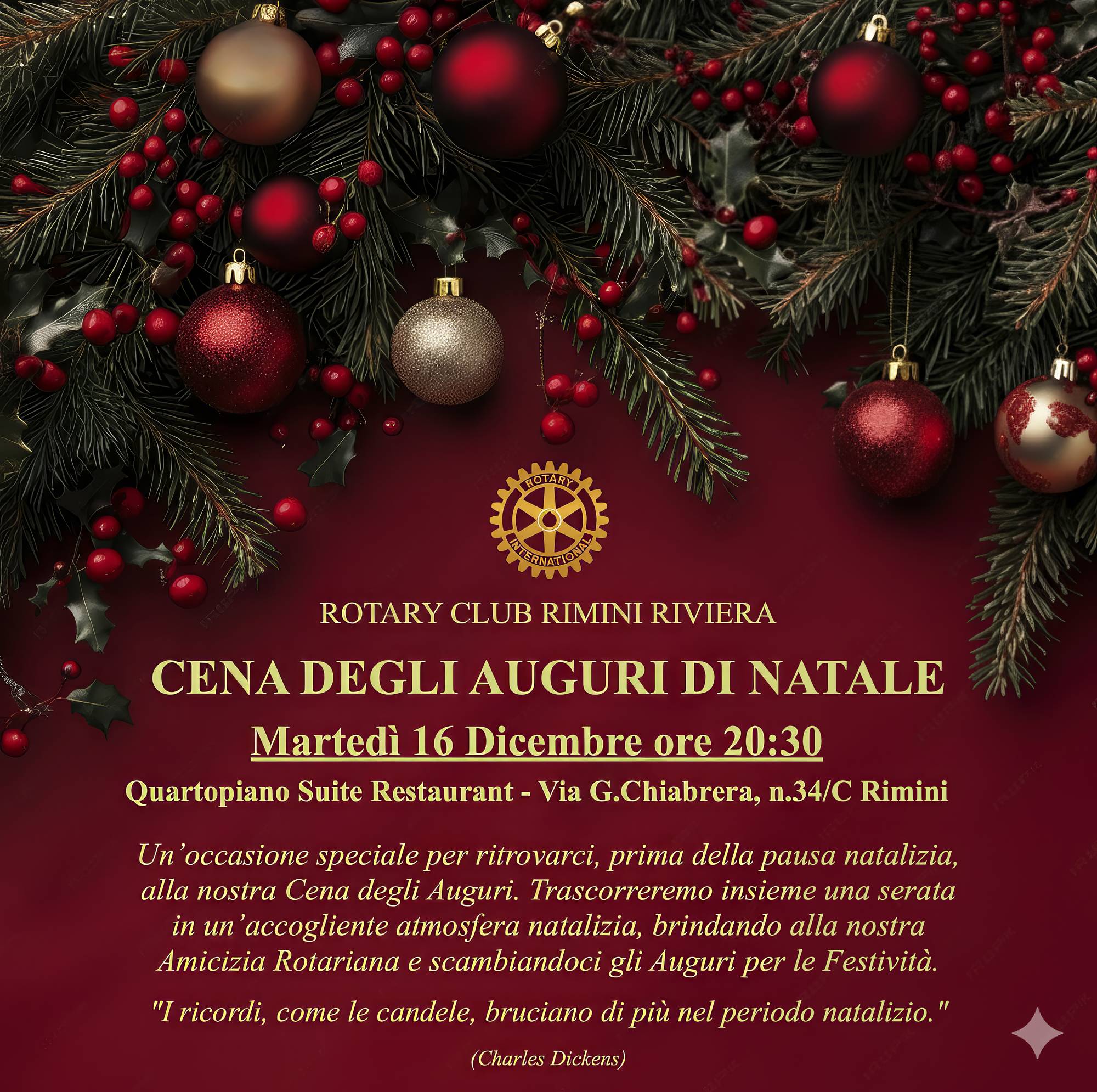 siamo ormai prossimi alla conclusione del I semestre di questa nostra Annata Rotariana 2025/2026 e quale migliore occasione che ritrovarci, prima della pausa natalizia, per la nostra tradizionale Cena degli Auguri di Natale che ci vedrà riuniti, tutti insieme ed in una bella atmosfera natalizia, per brindare in Amicizia Rotariana e per salutarci prima delle festività.