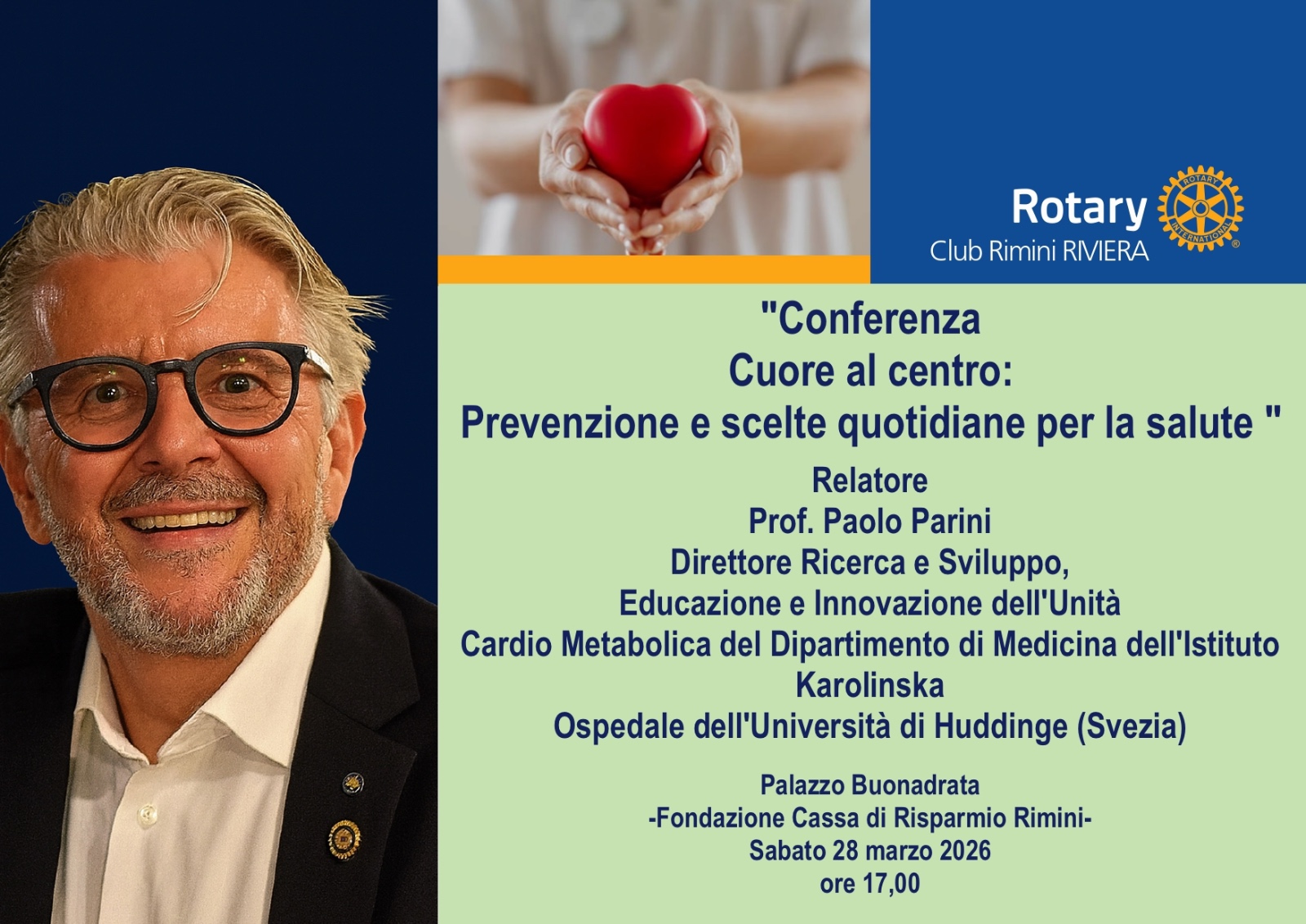 Il nostro Rotary Club Rimini Riviera torna a parlare, in questa IIa Edizione, di salute alla cittadinanza insieme al Rotary Club Rimini grazie al Prof. Paolo Parini, Professore di Chimica Clinica presso il Karolinska Institutet (Stoccolma - Svezia) e Direttore Ricerca, Educazione, Sviluppo & Innovazione. La conferenza aperta, come Service, alla cittadinanza vedrà trattare tematiche legate alla prevenzione ed alle scelte quotidiane per la salute. I nostri Soci Dr.ssa Giovanna Di Giannuario e Dr. Mauro Merli (Commissione Salute del Rotary Club Rimini Riviera) coordineranno i diversi momenti del convegno relativi alle conoscenze scientifiche per la prevenzione cardiovascolare ed ai comportamenti che proteggono il cuore.
