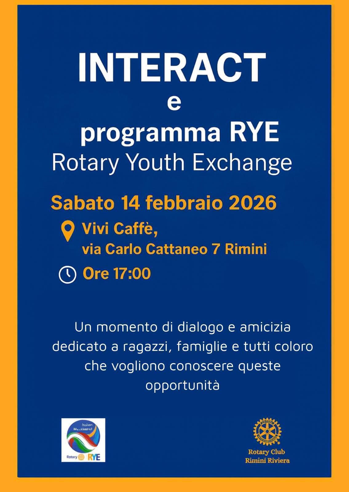 sabato 14 febbraio 2026 presso Vivi Caffè in via Carlo Cattaneo, n. 7 a Rimini (Palazzo Fabbri - Piazza Ferrari) alle ore 17 ci troveremo per un aperitivo con i ragazzi e le loro famiglie che stiamo coinvolgendo per rilanciare e ripartire con il nostro Interact Club.